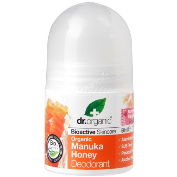 An antibacterial deodorant liquid cream roll-on, providing a number of skin care benefits; suitable for use on sensitive skin, this formula is made from certified Organic Manuka Honey blended with Aloe Vera, Sunflower oil, Icelandic and Irish Moss and Vitamin E, free from non-irritating chemical bactericides.