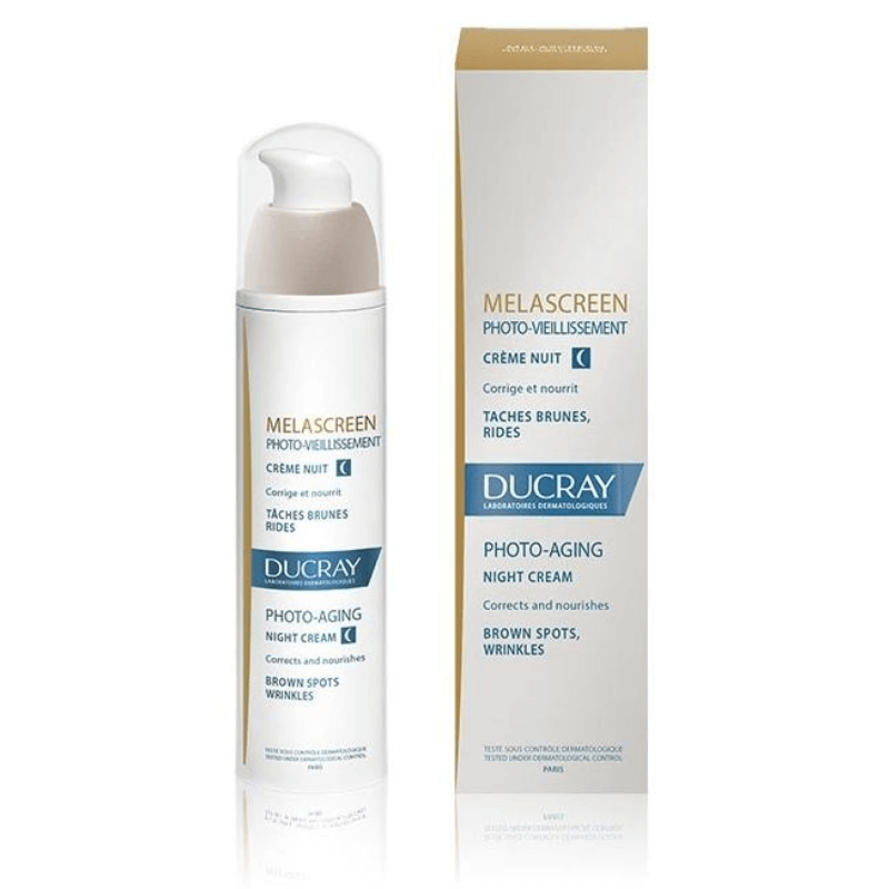 Ducray Melascreen Photo-Aging Night Cream with rich and moisturizing texture is a night cream act against premature ageing, brown spots and loss of firmness mainly. Additionally, its unique formula contains several active ingredients. It contains Synerwhite complex which corrects brown spots limiting the synthesis of melanin. Also, it contains vitamin C which enhances the collagen production to help fill in wrinkles. Moreover, it is rich hyaluronic acid, helps re-plump the skin. Therefore, due to its complex blend of ingredients, which includes a variety of emollients and antioxidants, this dermatologically-tested formula leaves the skin noticeably densified, balanced, and nourished.