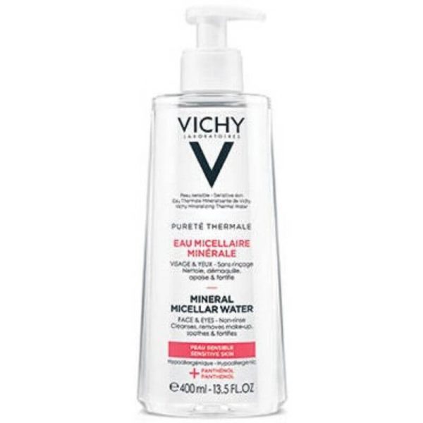 CLeansing micellar water for for face and eyes of sensitive skin. Enriched with Panthenol. With Vichy Mineralizing Thermal Water.  Soothes and fortifies.