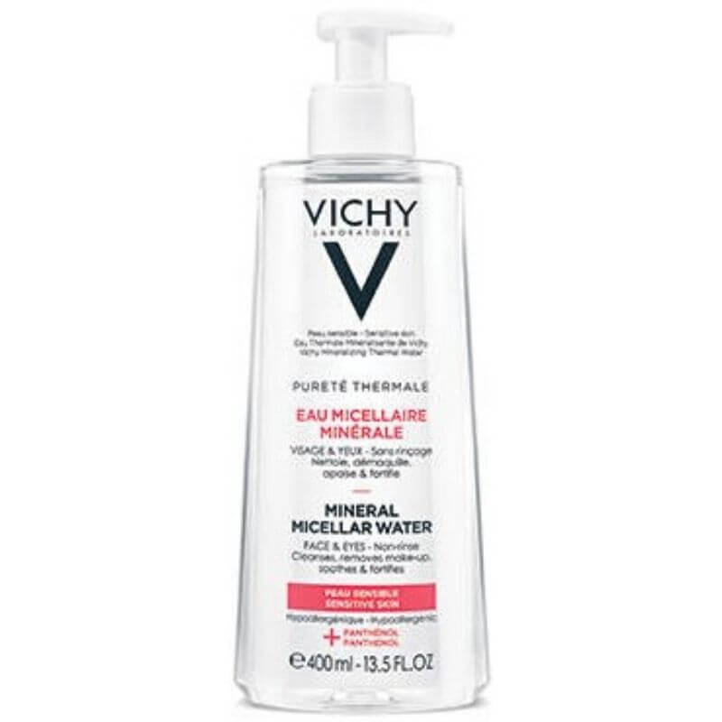 Vichy Mineral Micellar Water for sensitive skin cleanses skin and removes makeup from both face & eyes. Moreover, it contains Vichy Mineralizing Thermal Water and Panthenol (Pro-Vitamin B5). Moreover, this multi-benefit cleanser soothes & fortifies skin.